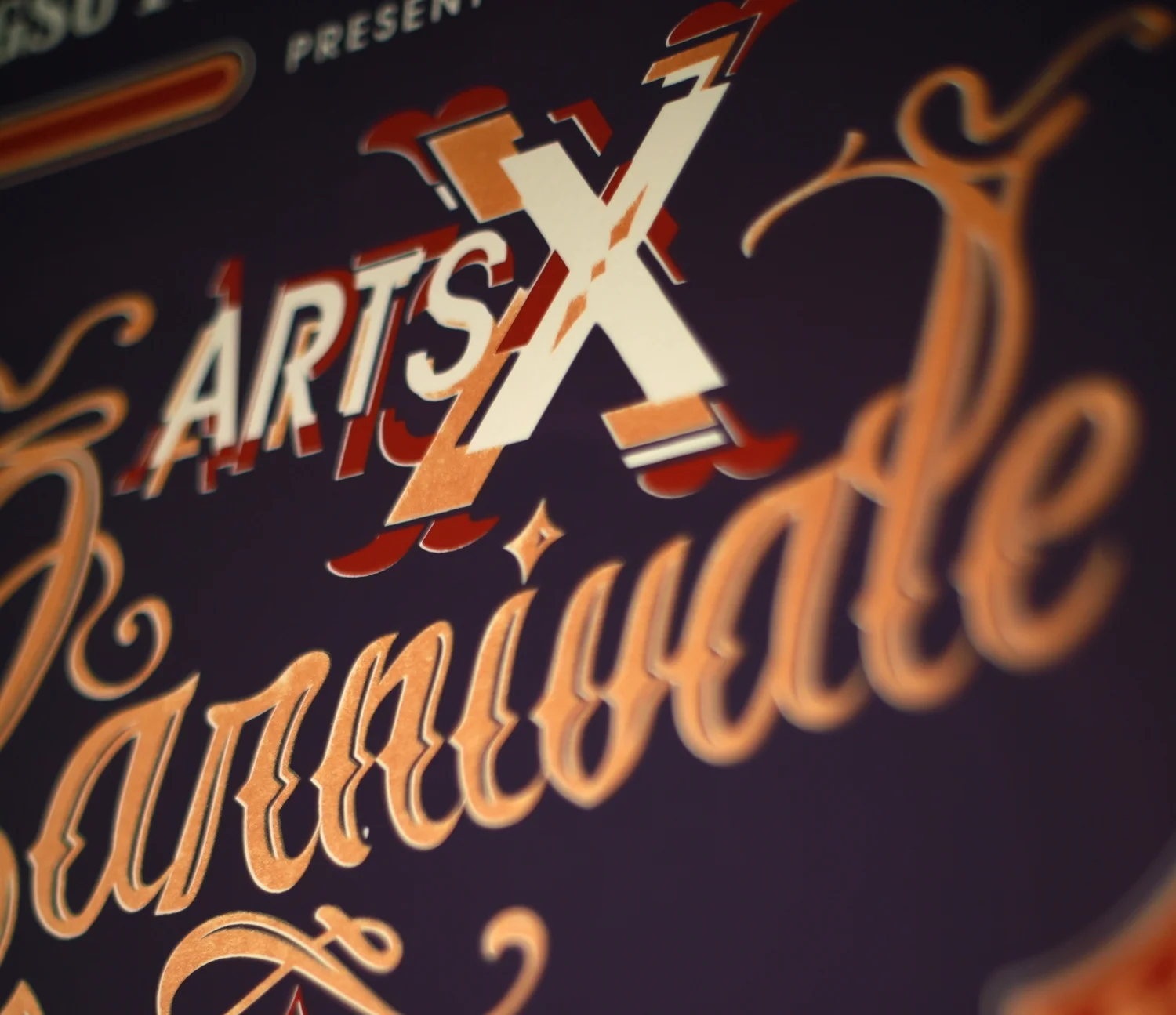 Project Description: ArtsX (Arts Extravaganza) is the largest event held by the Bowling Green State University School of Art. This event showcases all its different art clubs, classes, artwork, and faculty artwork. The event is the number one fundraiser held by the school for the clubs so it is important to have a large audience attend. Being on the 2013 design committee for ArtsX we chose to make the theme: Carnivale. The Venetian Carnivale is a celebration of the arts and performances within the community set in a nightlife atmosphere, making the theme perfect for the event. We designed multiple print pieces (invites, posters, brochures, maps, advertising), web pieces, and decorated the event themed around Carnivale. Working as a team we branded the event with rich colors and iconic type, making it look and feel like a true Venetian Carnivale.