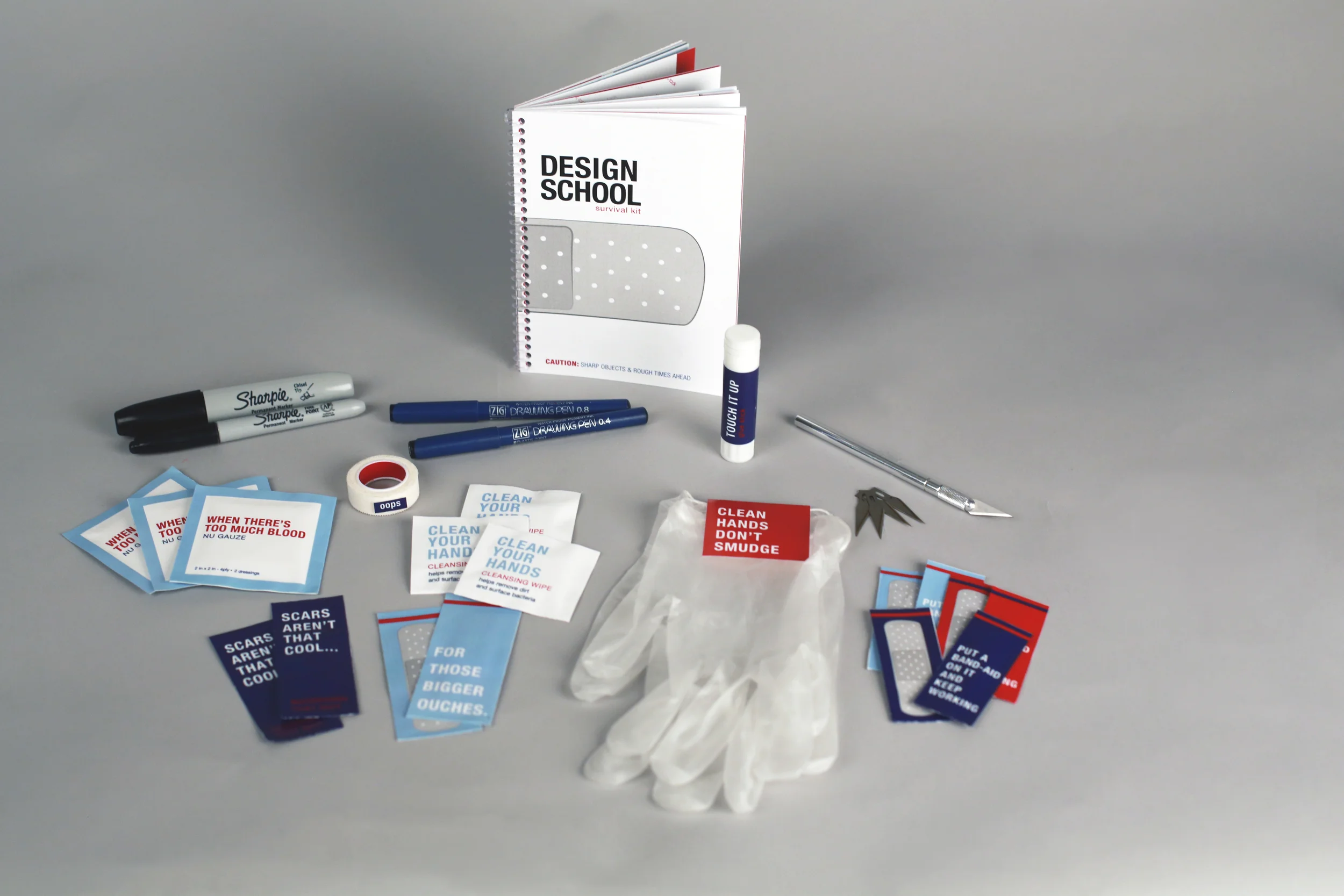 Project Description: Writing and designing a book on process. Focusing on a topic close to home: Design School. This book is all about the do’s and don’ts of design school and how to survive it with all your fingers attached. Chip Kidd’s, “Cheese Monkeys” book helped inspire to write it in a satirical nature making it more relatable to the target audience. The minimal color palette of reds and blues helped relate it to a first aid kit. The book was also accompanied by providing plenty of medical supplies and design necessities for those late nights, shaky hands and accidental cuts.